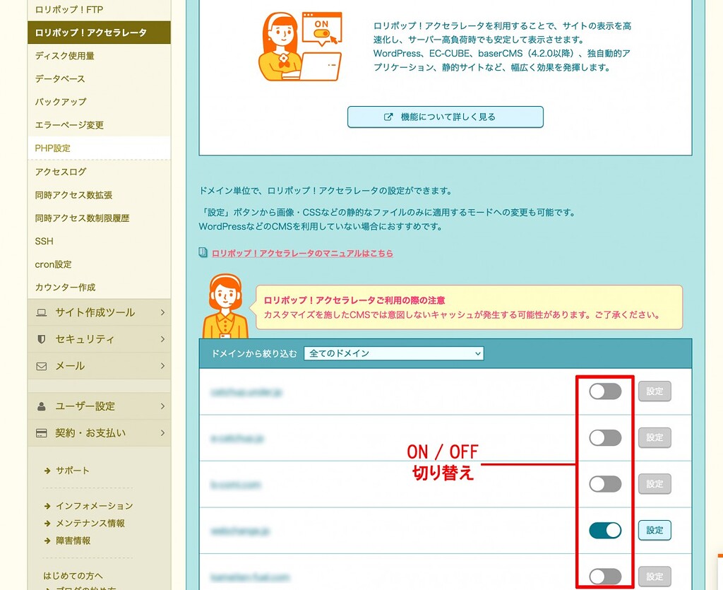 baserCMSでは、ロリポップ!アクセラレータ機能がONになっている際にログインエラーなどが報告されています。