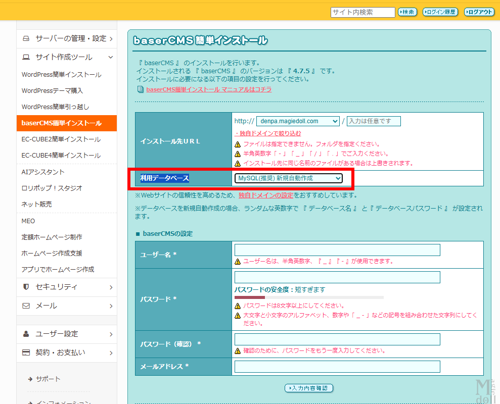 baserCMS簡単インストール画面に移動し、利用データベースのプルダウンメニューからMySQL(推奨)新規自動作成を選択。これでデータベースが新規作成されるはずです。