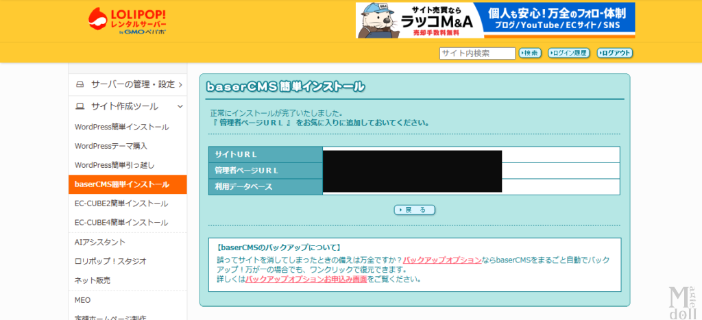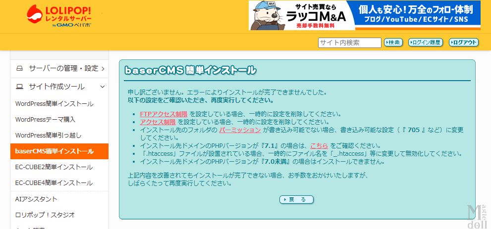 ロリポップのサイト作成ツールからbaserCMS簡単インストールをポチッと開始。