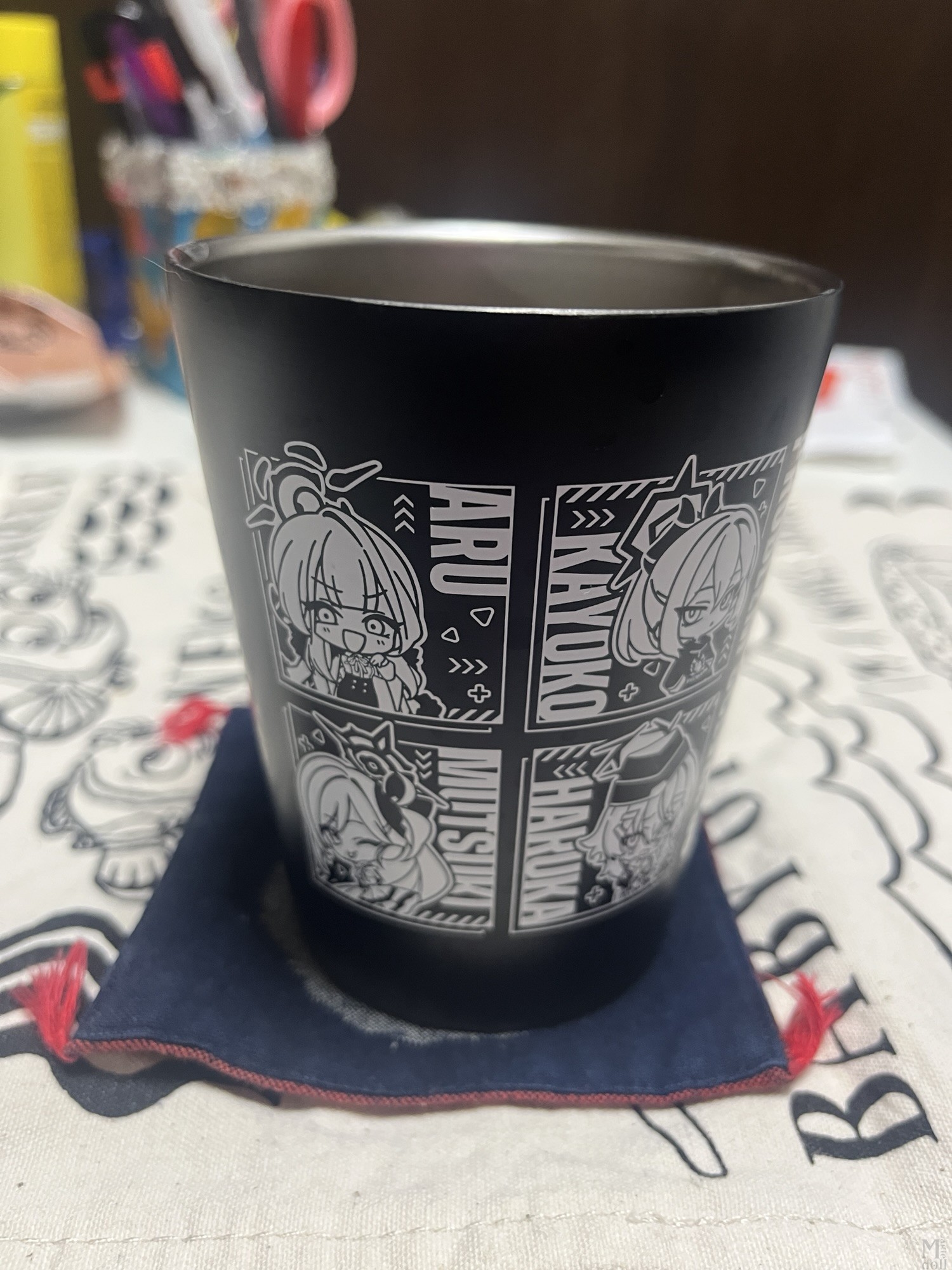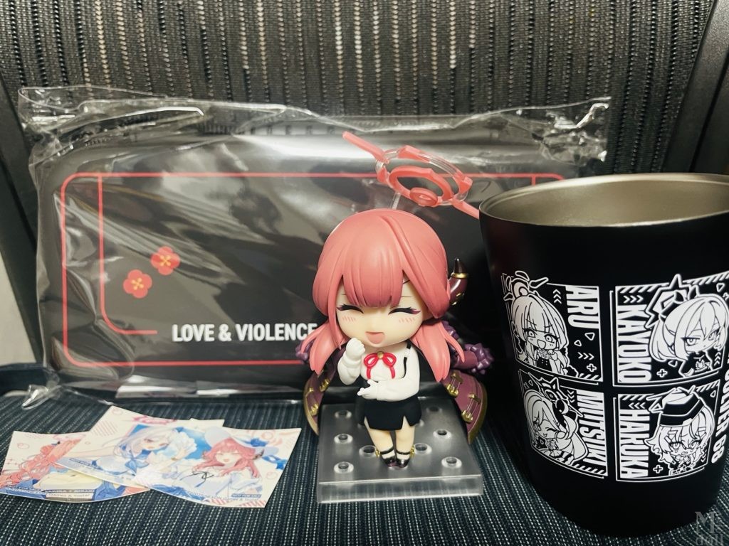 これは購入したグッズ。次に便利屋のグッズが来るのはいつになるのか分からないので、早めの誕生日プレゼント~と思い、ムツキのバッグ風ポーチと便利屋のタンブラーをゲット。