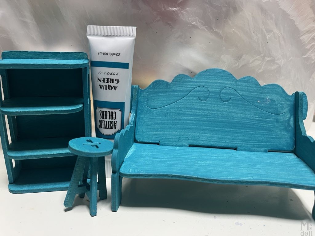 むかーしダイソーやキャンドゥで木工工作キットの家具を売っていたのですが、白くて味気ないのでセリアのアクリル絵の具・アクアグリーンで塗ってみました。良い色!
