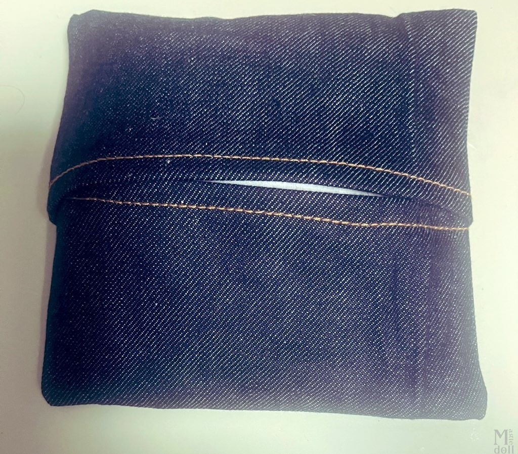 おまけ。真四角のポケットティッシュ入れをミシンで作りました。ジーンズ生地に太い糸(20番)でチャレンジしたのですが、ミシンが機嫌を損ねることなく縫えたので良かったです。20年ほど連れ添った先代のミシンから新しくコンピューターミシンをお迎えしたのですが、自動で調節して賢いですね。
