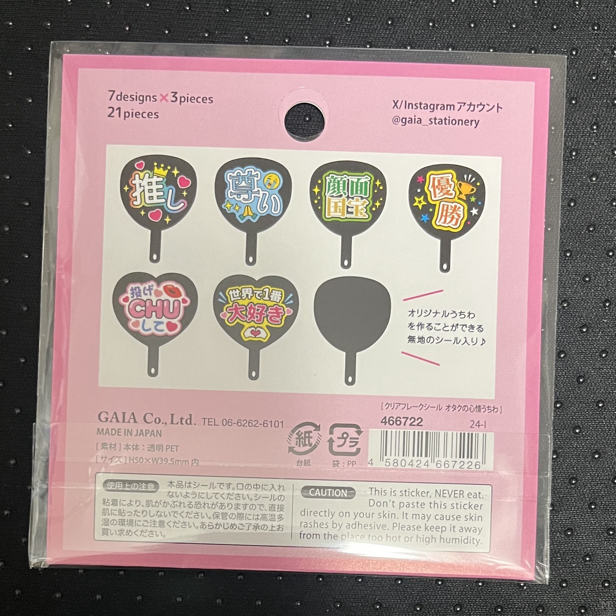 内容は、「推し♡」「尊い」「顔面国宝」「優勝」「投げCHUして♡」「世界でいちばん大好き」と無地の7種……が、3枚ずつ。大盤振る舞いです。