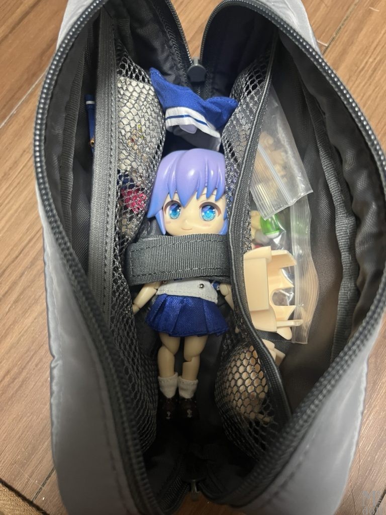 普通のお出かけではなく、帰省などのちょっとの遠出用に無印良品のガジェットポーチを使っています。ねんどろいどどーる一人の持ち運びに、ポケットも付いていて便利です。