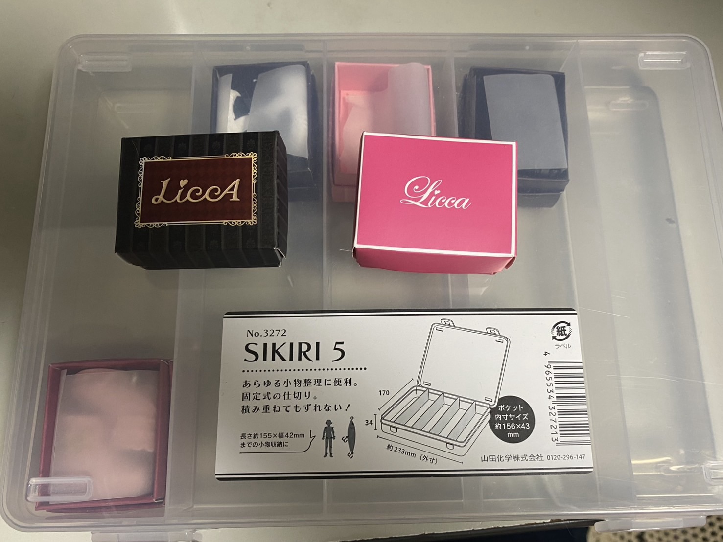 xで「SIKIRI5」でリカちゃんのシューズコレクション(ガシャポン)がきれいに収納できると見かけて、ちょうど家にSIKIRI5があったので使ってみました。一列に三個、箱ごとピッタリ入ります!