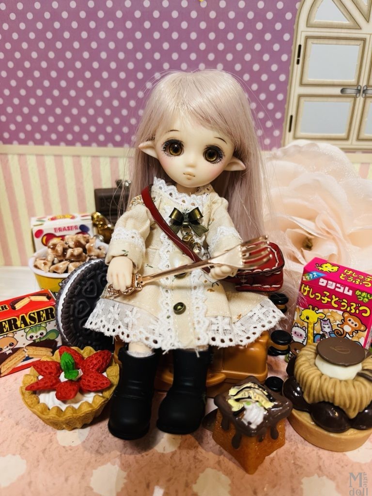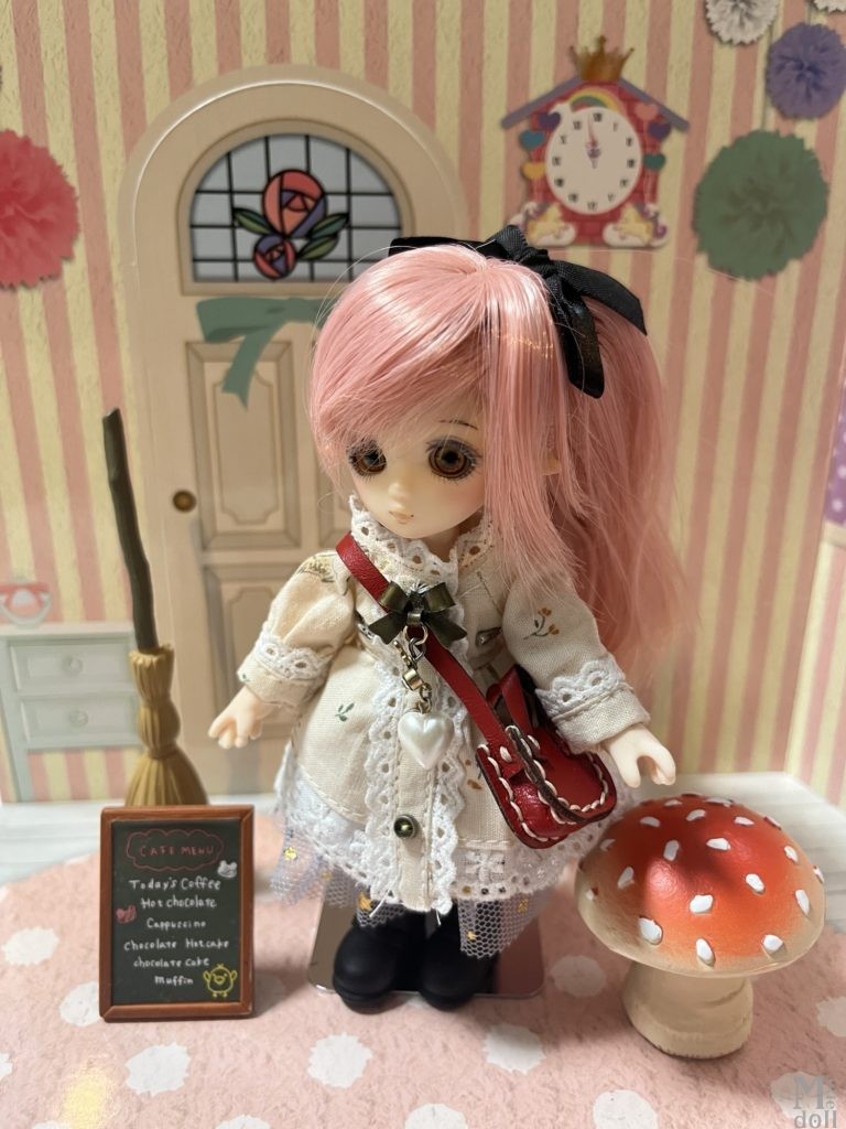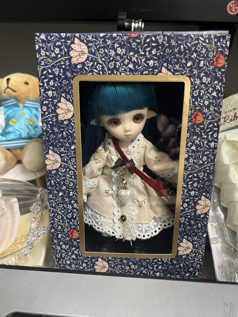これはseriaの紙ケース(ウィリアム・モリス仕様)に収納したオビツ11娘。そのままで飾ると猫がぺろぺろするので丁度いい感じです。